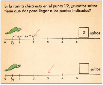 En este acercamiento introductorio se incluye también la representación de algunas fracciones en la recta numérica (figura 7). Una representación aparentemente tan alejada del pensamiento de los niños pequeños era considerada accesible porque se suponía dotada de significado a través de “los saltos de la rana”, recurso didáctico utilizado profusamente con los números naturales en el primer grado.
