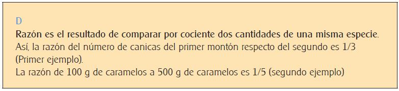 Esta noción tiene un elaborado tratamiento; su inclusión constituye una innovación en la enseñanza de las fracciones. Se inicia en el quinto grado, explicitando que la razón es una forma más de interpretar las fracciones, según subtítulo de la lección “La tienda de pinturas: Fracciones como relaciones o razones” (SEP, 2002c, 142-143). El contexto de mezclas resulta útil para vincular, a partir de situaciones problemáticas, fracciones sencillas (como 5/8) con expresiones del tipo “Litros de pintura blanca por cada litro de pintura verde”, o “Fracción de pintura blanca que hay en la mezcla”.