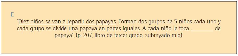 Es importante señalar que la idea de fracción como cociente (resultado de un reparto) se desarrolla sin apoyo de representaciones gráficas. Son situaciones planteadas verbalmente las que vinculan al sub-constructo con el CE de los estudiantes, tal como se ve en el problema inserto en el recuadro E. Esto se debe probablemente a que la actividad de repartir está más vinculada a la acción efectiva que la de sombrear figuras (Kerslake, 1986, p. 90), y al ser más dinámica, es más difícil de representar.