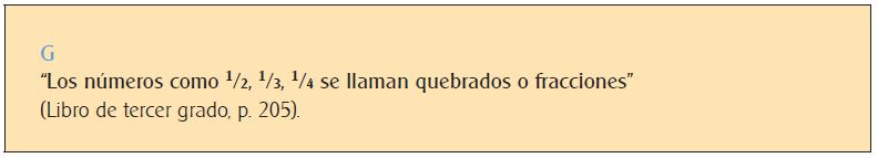 La noción de fracción en este currículo presenta una cierta ambivalencia: llamarse quebrado y a la vez llamarse fracción. Esta ambivalencia se observa a lo largo de la primaria. La noción se introduce en segundo grado apelando a las experiencias cotidianas de los niños: se presentan mitades o cuartos de pasteles, frutas, colecciones de objetos, o precios de juguetes que se fraccionan en terceras o cuartas partes.