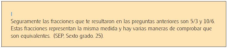 La noción de equivalencia se vincula a situaciones donde se hacen repartos equivalentes (SEP; 2001b, p. 93-93) o a situaciones en contexto de medición o saltos de animales: por ejemplo, “Un salto de 1/2 metro es igual a un salto de 2/4 de metro” (SEP, 2002b, p. 135). Pero la equivalencia se lleva a otros contextos: en una lección de sexto grado la actividad se ubica en la notación musical: ¿Cuántas corcheas equivalen a una blanca?, ¿Qué parte de una redonda es una corchea?, El nivel TS se introduce solicitando establecer la equivalencia entre una fracción (5/4) y tantas notas blancas, o negras, o corcheas como sean necesarias para completar el tiempo musical anotado (SEP, 2001p. 21). Una tabla de números proporcionales que los estudiantes han de llenar a partir de calcular el listón para varios moños, resulta útil para acercar más al nivel TS e incorporar una formalización local sobre la equivalencia: