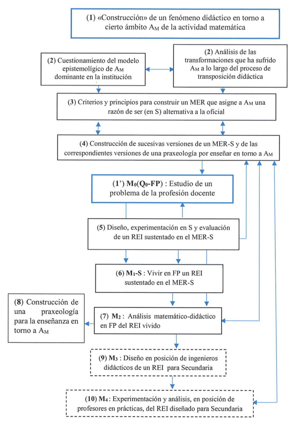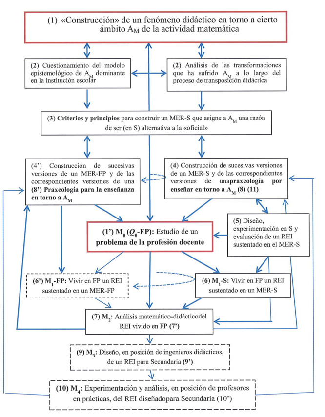 Tenemos, en definitiva, dos estrategias que pueden ser útiles para la construcción de praxeologías matemáticas para la enseñanza y que, en cierto sentido, son complementarias. Mientras que la primera descansa en un trabajo previo teórico y experimental en el ámbito de la enseñanza para desembocar en la problemática de la formación del profesorado, la segunda recorre el camino inverso. Pero, en ambos casos, las estrategias pivotan entre la construcción de un fenómeno didáctico en torno a cierto ámbito de la actividad matemática escolar (1) y el estudio de un problema de la profesión docente (1’).