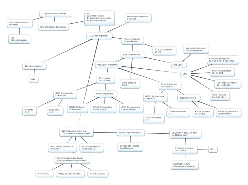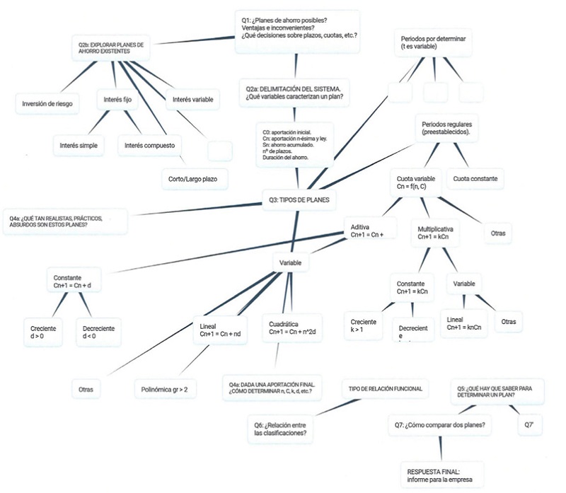 Este mapa constituye el primer esbozo de una praxeología para la enseñanza en torno a la modelización funcional elemental reconstruida por la comunidad de estudio. En dicho mapa aparecen determinadas caracterizaciones de los planes de ahorro (inicialmente mediante la ley recursiva que relaciona cada cuota con la anterior) y, consecuentemente, caracterizaciones de los modelos funcionales asociados a cada tipo de plan de ahorro.