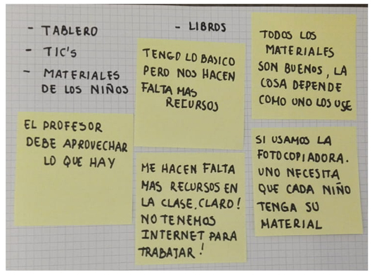 En las primeras representaciones de Miguel sobre su sistema de recursos, su mirada era aún bastante limitada y priorizaba los recursos (materiales) que se incluían directamente en la clase y que usaba de manera más habitual, sin tener en cuenta la sala de computación o el trabajo colaborativo. En ese entonces, el profesor consideraba que contaba con los recursos básicos para la clase, aunque reconocía que recursos como las tabletas electrónicas podrían ser muy convenientes.
