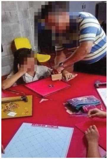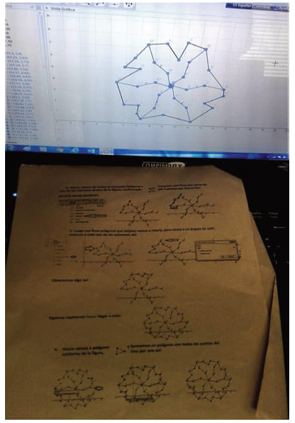 En varias ocasiones (e.g. observaciones de clase o entrevistas) se detectó que Miguel pone énfasis en actividades propias del paradigma de la geometría elemental (Kuzniak, 2011). En este paradigma, la actividad está estrechamente ligada con el mundo real, donde la fuente de validación es lo sensible; aquí es posible el juego modelo-realidad y es muy importante la medida, la aproximación y la estimación. Como se mencionó en el marco teórico, el uso de instrumentos es esencial en el paradigma de la geometría elemental, y es justamente una de las actividades priorizadas por Miguel en sus clases: por ejemplo, durante la construcción del geoplano en el que los estudiantes midieron, trazaron, representaron figuras usando retazos de lana y usaron diversos instrumentos (ver figura 2). En ese caso, la medición jugó un papel doble: por un lado, los niños realizaron mediciones en el proceso de construcción del geoplano; pero también las usaron para validar que sus construcciones estuvieran bien hechas para que, si no, hicieran las modificaciones necesarias.