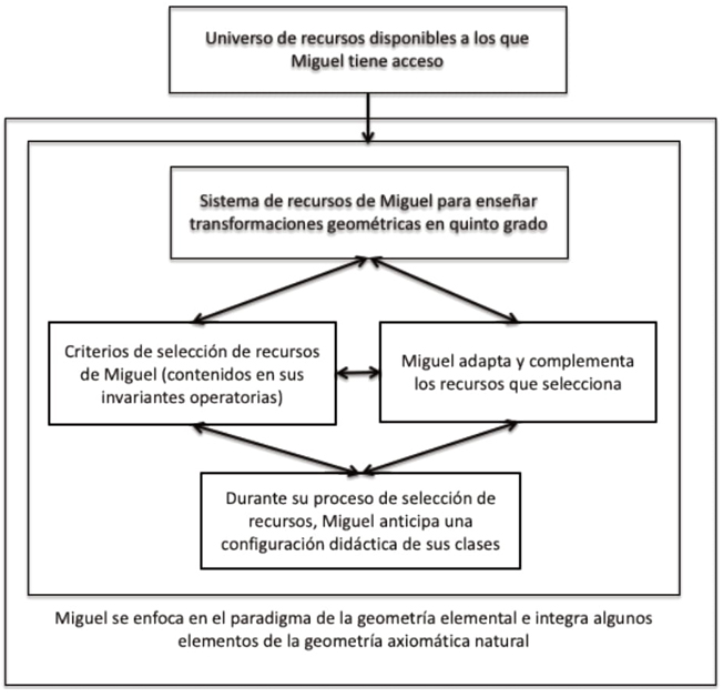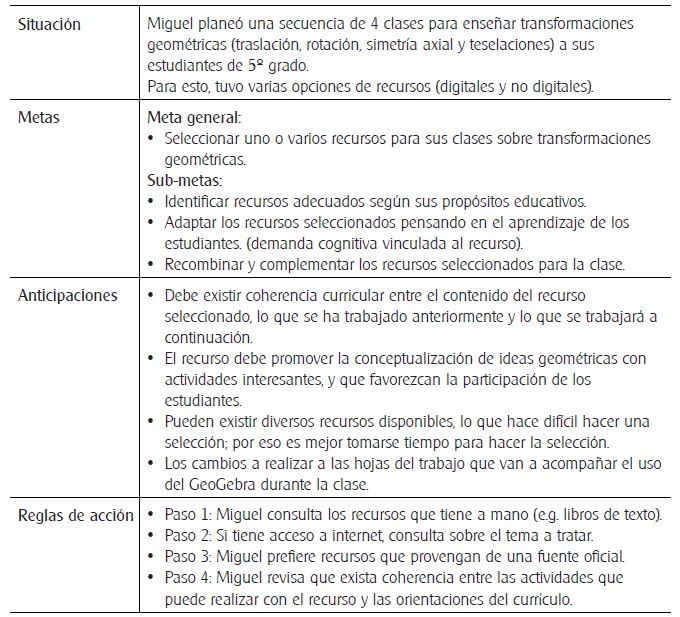 Asimismo, tomamos la metodología de la investigación reflexiva de la ADD (Gueudet & Trouche, 2012) para estudiar el proceso de selección de recursos del profesor Miguel (seudónimo), sujeto del estudio de caso (ver sección de Metodología). Dicha metodología nos permitió analizar el proceso de selección de recursos de este profesor para enseñar transformaciones geométricas en su clase de quinto grado de primaria.