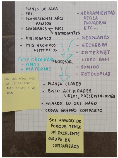 Lo interesante en esta primera etapa fueron las reflexiones de Miguel (puestas mediante Post-Its sobre su mapa, como puede verse en la figura 1): por ejemplo, en ellas insistió en el protagonismo de los recursos digitales y en que es trabajo del profesor sacarle provecho a los recursos que usa. Para Miguel es muy importante que se les suministren materiales a los estudiantes (que contengan situaciones atractivas) y que la clase no sea solamente el discurso del profesor.