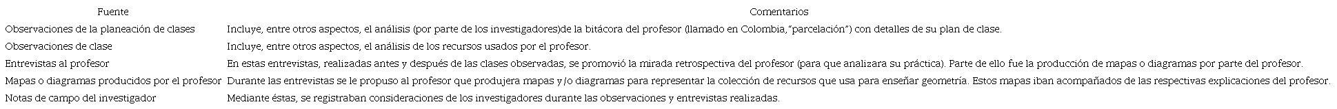 Además de las observaciones a las 9 sesiones de clase, en nuestra investigación utilizamos las siguientes fuentes de toma de datos (resumidas y explicadas en la tabla 1): observaciones de las planeaciones de clase; entrevistas al profesor (antes y después de las clases observadas); producción de mapas o diagramas por parte del profesor (ver figura 1); y toma de notas de campo por parte de los investigadores durante todo lo anterior.