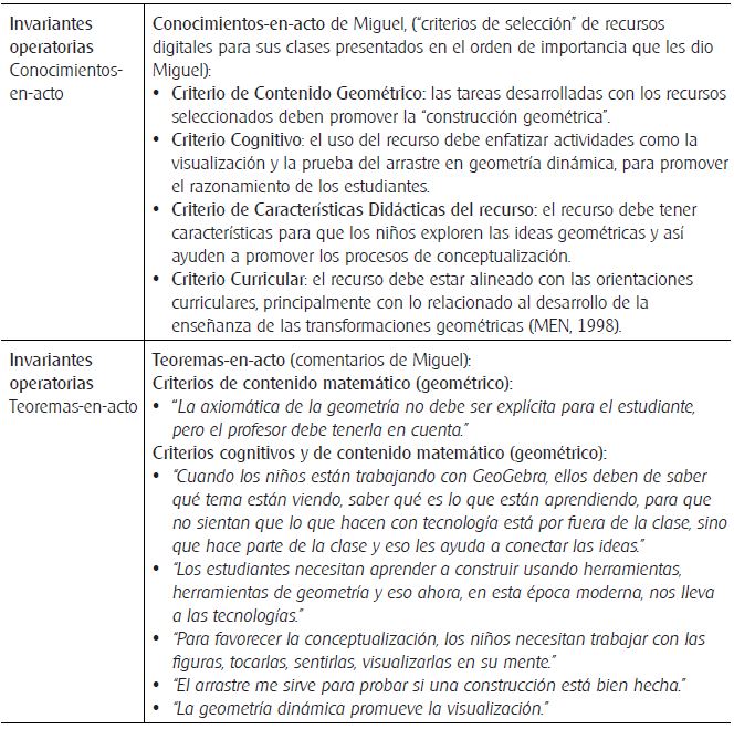 Las invariantes operatorias constituyen la médula del ESR_M y corresponden a los conocimientos (explícitos o implícitos) contenidos en el esquema que le permite a Miguel orientar su acción para dar cuenta de la situación en la que se encuentra. Las invariantes operatorias de Miguel (conocimientos-en-acto yesquemas-en-acto) tienen que ver con sus consideraciones epistemológicas, curriculares, didácticas y cognitivas y están regidas por el paradigma de la geometría elemental. Al respecto, el profesor exhibe un conocimiento-en-acto cuando sostiene que los niños de quinto grado no requieren aprender explícitamente la axiomática de la geometría (euclidiana) que están trabajando; al mismo tiempo sostiene que, como profesor, sí la debe de saber y tenerla en cuenta en las actividades que propone en clase. Este es un acuerdo central en el paradigma de la geometría elemental y un conocimiento fundamental en la acción de Miguel.