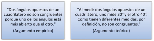 Sobre la naturaleza de los argumentos, Boero (1999) distingue entre argumentos empíricos y teóricos. En un argumento empírico la validez recae en las mediciones, en la evidencia visual y las referencias corporales, si eso lo acepta la comunidad en la que se quiere validar determinada proposición. Mientras que los argumentos teóricos se basan en el uso de elementos que conforman la teoría que dicha comunidad ha establecido como válida: definiciones, postulados o teoremas (figura 1).