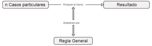 Finalmente, un argumento inductivo surge principalmente en el proceso de conjeturación. En este tipo de argumentos, se tienen varios datos o proposiciones particulares D1, D2, D3,... ,Dn de una proposición general D que producen un mismo resultado, que corresponde a la aserción. Ello conlleva a la formulación de una proposición o regla general. La regla obtenida en este tipo de argumento es provisional, es decir, es una proposición plausible. En este caso, lo que se concluye es la garantía (figura 4).
