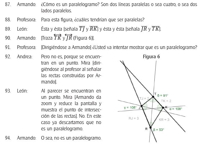 Se evidencia la construcción de un argumento colectivo, el cual es deductivo empírico. Los datos (¬q) son la información visual de la intersección de las rectas, y , que contienen dos lados (Andrea, [92]), la garantía (p→ q) es la definición personal de Armando de paralelogramo [87] y la aserción (¬p ) es que la figura no es un paralelogramo (León, [93]). Es decir, han utilizado el esquema de razonamiento válido Modus Tollendo Tollens,6 esquema en el que se usan las negaciones de proposiciones.
