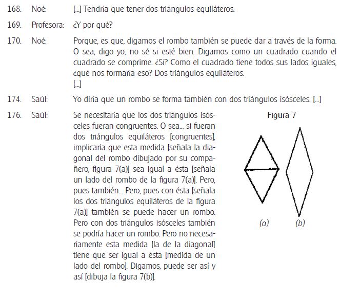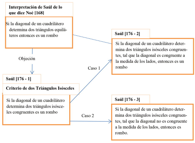 Saúl quiere expresar su acuerdo parcial de lo que expuso Noé, pero enuncia la proposición inversa de la Afirmación A de Noé, sin saber que no son necesariamente equivalentes. Es decir, afirma que: si la diagonal determina triángulos equiláteros entonces es rombo. Con el propósito de justificar su afirmación, Saúl construye una cadena de argumentos [176]. El primer argumento es precisamente el establecimiento de la inversa, convencido de que está reportando lo que dijo Noé. En el segundo argumento, Saúl asevera que si la diagonal del cuadrilátero determina dos triángulos equiláteros (datos), entonces la medida de la diagonal será igual a la medida de los lados (aserción). La garantía implícita de este argumento deductivo es la definición de triángulo equilátero. El tercero argumento, que es empírico, parte del hecho de que si la figura es un rombo (datos), entonces no necesariamente la medida de la diagonal es igual a la de uno de los lados (aserción). La garantía implícita son las representaciones de rombo que hicieron en el tablero. A partir de esto, Saúl establece lo que denominamos el Criterio de Dos Triángulos Isósceles, al cual se va a referir más adelante.