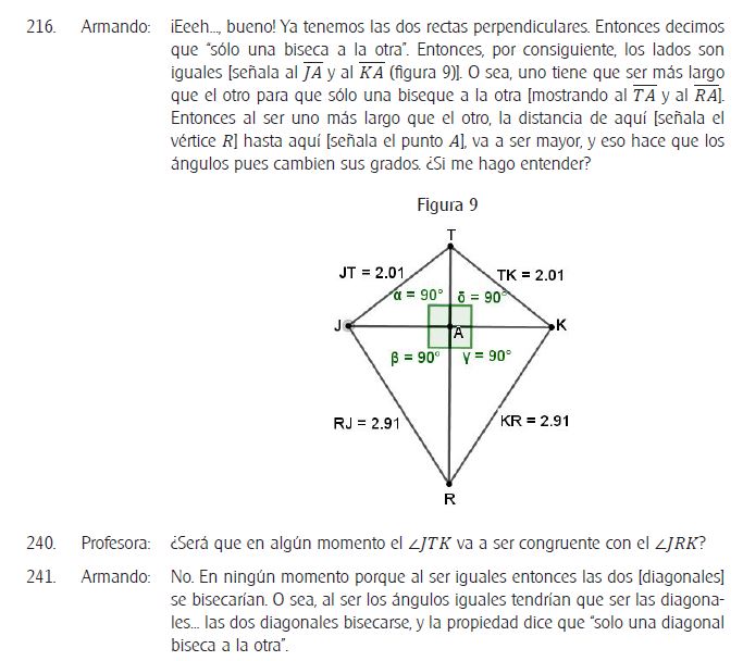 Debido al cuestionamiento de la profesora, Armando emite otro argumento [241], usando la negación del consecuente de la condicional que quiere demostrar (datos); es decir, asume que la figura tiene dos pares de ángulos congruentes. Su aserción es que sus diagonales se tendrían que bisecar. Esto, junto con la propiedad que ya se conoce de las diagonales de una cometa, conforman la proposición r y ¬r. Por ello, como si conociera el Principio de Reducción al Absurdo, deduce que los ángulos no pueden ser congruentes. Esto convierte su argumento en una demostración por contradicción, en la que no se presentó alguna dificultad de las mencionadas por Antonini y Mariotti (2010).
