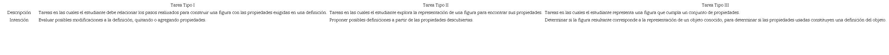 La tarea 1 es del tipo II porque los estudiantes tienen que descubrir las propiedades de la Figura Incógnita para poder proponer una definición; la tarea 2 y la tarea 3 son del tipo III porque requieren usar las propiedades elegidas en la construcción de una figura, para determinar si representa o no la Figura Incógnita y así justificar si las propiedades la definen o no. En el proceso de solucionar las tres tareas, surgen tareas tipo I cuando, para construir posibles definiciones de la Figura Incógnita, los estudiantes representen una figura a partir del conjunto de propiedades que seleccionaron, para así determinar cuáles son necesarias y cuáles se pueden eliminar.