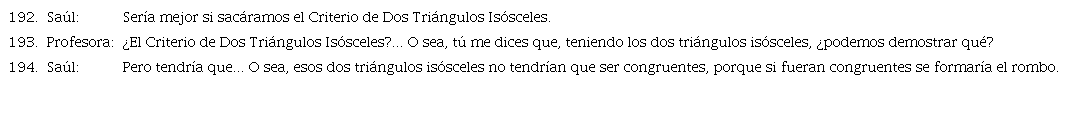 En la anterior intervención, Saúl intenta justificar por medio de un argumento deductivo teórico que si se tiene la Figura Incógnita (dato), entonces una diagonal determina dos triángulos isósceles no congruentes (aserción). Para construir la justificación, agrega como dato la negación del consecuente, es decir, supone que la diagonal determina dos triángulos isósceles congruentes [194]. Utilizando el Criterio de Dos Triángulos Isósceles [192] como garantía, concluye como aserción que la figura sería un rombo [194]. Con esto Saúl llega a una contradicción, pues anteriormente había afirmado que la Figura Incógnita no es un rombo. Así concluye que la afirmación que negó es verdadera. El esquema de la justificación de Saúl corresponde a una demostración por contradicción. Hizo la demostración indirecta sin dificultades.