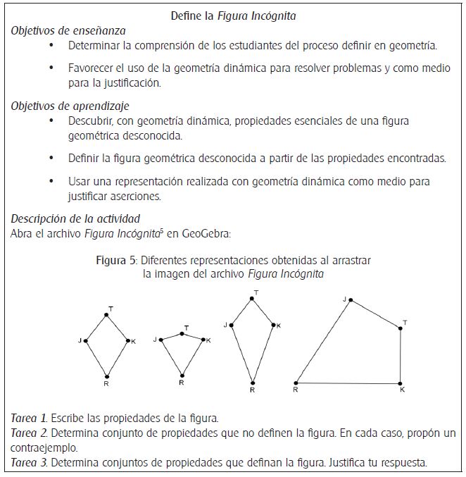 Para definir en geometría, es necesario establecer las diferencias de un objeto con otros similares, pues una definición agrupa a las figuras que comparten un conjunto específico de atributos (Herbst, et al., 2005). Estos investigadores promulgan que para desarrollar el proceso de definir en la clase de geometría, es necesario crear escenarios en los cuales los estudiantes describan figuras geométricas, para determinar atributos comunes que permitan definirlas y diferenciarlas de otras. Estos escenarios también deben promover que los estudiantes generen ejemplos de figuras a partir de un conjunto de propiedades específicas. Precisamente, la geometría dinámica es un escenario en donde el estudiante puede asumir este proceso como una actividad creativa y entender que las definiciones no son parte de un cuerpo teórico inmutable (Govender, 2003). Además, su uso contribuye a generar un ambiente de participación y de interacción en el aula (Perry, Samper, Camargo y Molina, 2013).