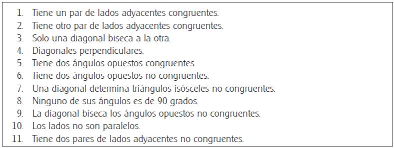 Después de que los estudiantes de cada grupo han trabajado independientemente en la formulación y justificación de definiciones para la Figura Incógnita, es decir para el cuadrilátero denominado cometa, se abre un espacio para la comunicación de resultados. Ambos grupos reportan que una posible definición es: Una cometa es un cuadrilátero con diagonales perpendiculares, tal que solo una biseca a la otra. La profesora cuestiona si la definición que proponen asegura la no congruencia de dos ángulos opuestos (Propiedad 6). El siguiente fragmento corresponde a la justificación dada por un estudiante: