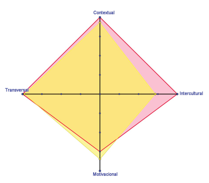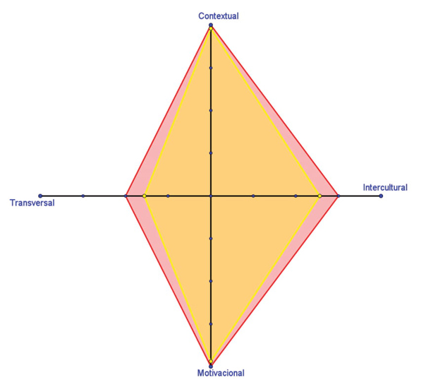 Traspasados los resultados de la rúbrica al esquema de los cuadriláteros CIMT, puede verse que tanto profesor como alumnado coinciden bastante en lo que respecta a los impactos contextual y transversal, mientras que existe una cierta discrepancia en la opinión que hay de los otros dos impactos. Probablemente, la diferencia de calificación en el impacto motivacional viene dada por el hecho de que haya habido alumnado que se haya distraído en la proyección de la película (comentario de la tabla 4) aunque, en general, al alumnado le ha gustado la actividad. Por otro lado, la discrepancia en el impacto intercultural puede venir determinado por la poca sensación que tiene el alumnado de haber aprendido cosas ajenas a su propia cultura. Finalmente, cabe decir que el área del cuadrilátero CIMT del alumnado es poco más de 14% menor que la del cuadrilátero CIMT del profesor con lo que, una vez más, parece que el impacto global de la actividad en el alumnado ha sido inferior a las expectativas.
