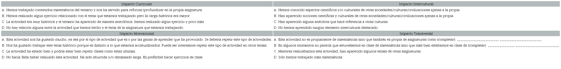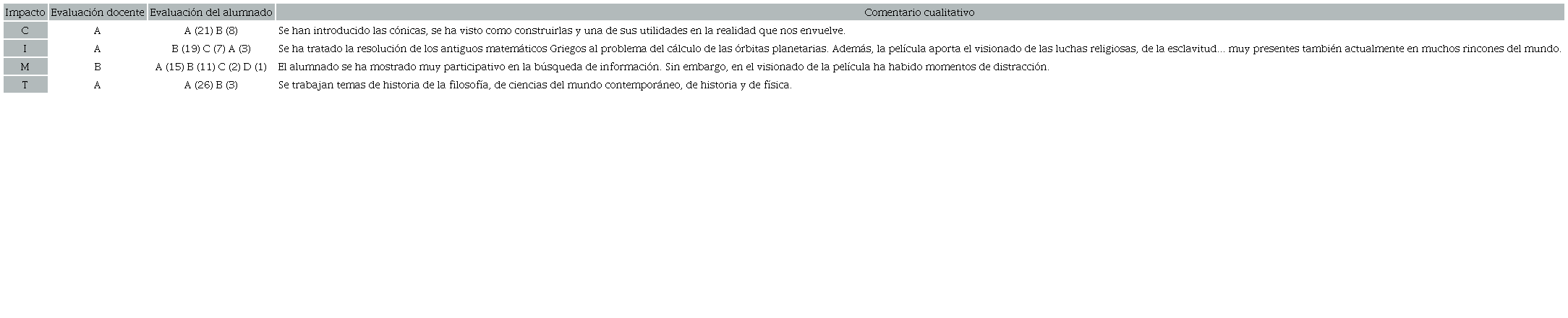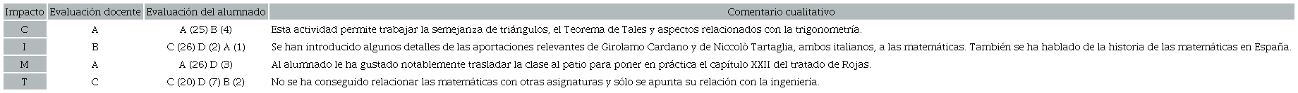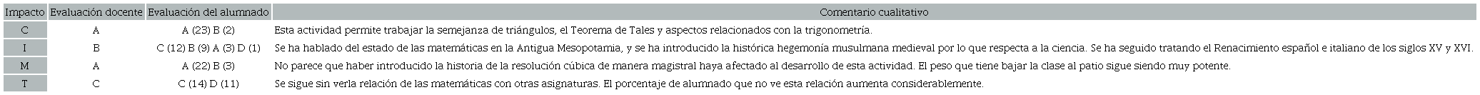 Dentro de la experiencia cotidiana del aula, cada una de las veces en las que se ha ido introduciendo la historia de las matemáticas dentro de las unidades didácticas, se ha intentado evaluar tanto la planificación, como la implementación y los resultados de aprendizaje que se han obtenido con ella. Al principio, sólo la sensación de éxito o fracaso era el indicador principal de evaluación, pero, tras debatir y argumentar con otros compañeros y compañeras docentes, y analizar las replanificaciones obtenidas, se vio factible la posibilidad de elaborar una rúbrica para analizar los cuatro impactos descritos para cada una de las actividades. Con todo, pasamos a detallar ahora los cuatro posibles resultados de cada una de las rúbricas de los impactos evaluados.