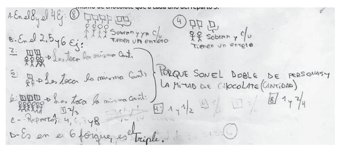 Al socializar los procedimientos, algunas parejas comenzaron a explicitar la relación entre las cantidades de chocolates y de niños y los números correspondientes al numerador y denominador de la fracción resultante del reparto. Luca y Ramiro fueron los primeros en hacer circular esta nueva relación a propósito del reparto N°2 (2 chocolates entre 4 niños):