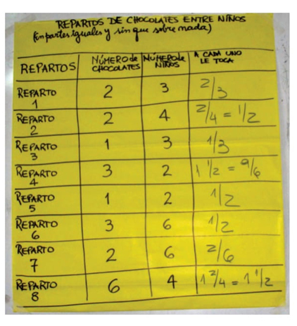 Las relaciones que las niñas iban estableciendo para responder las cuatro preguntas y la disposición de las cantidades en el cuadro de los repartos promovieron que Yael comenzara a observar una regularidad sustancial [10] : los números que indican la cantidad a repartir y la cantidad de partes entre las que se reparte, corresponden respectivamente al numerador y al denominador de la fracción resultante. Si bien este descubrimiento se circunscribió en un principio a los repartos N°3 y N°5, la interacción con Camila [11] [12] [13] facilitó que Yael elaborara la idea de que era posible extender la relación a todos los repartos del cuadro.