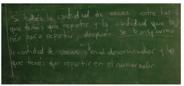 (Queda escrito: “Si sabés la cantidad de veces entre las que tenés que repartir y la cantidad que tenés para repartir, después se transforma la cantidad de veces en el denominador y lo que tenés que repartir en el numerador”. Posteriormente se pasa en limpio al afiche)