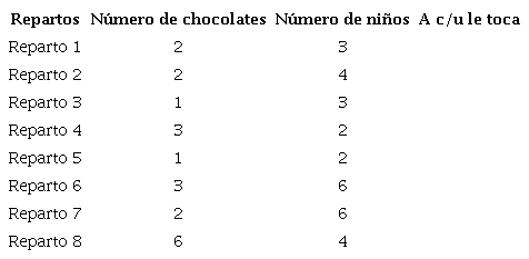 El problema matemático consistía en la comparación de 8 repartos diferentes de chocolates entre niños, en partes iguales y sin que sobrara nada:
