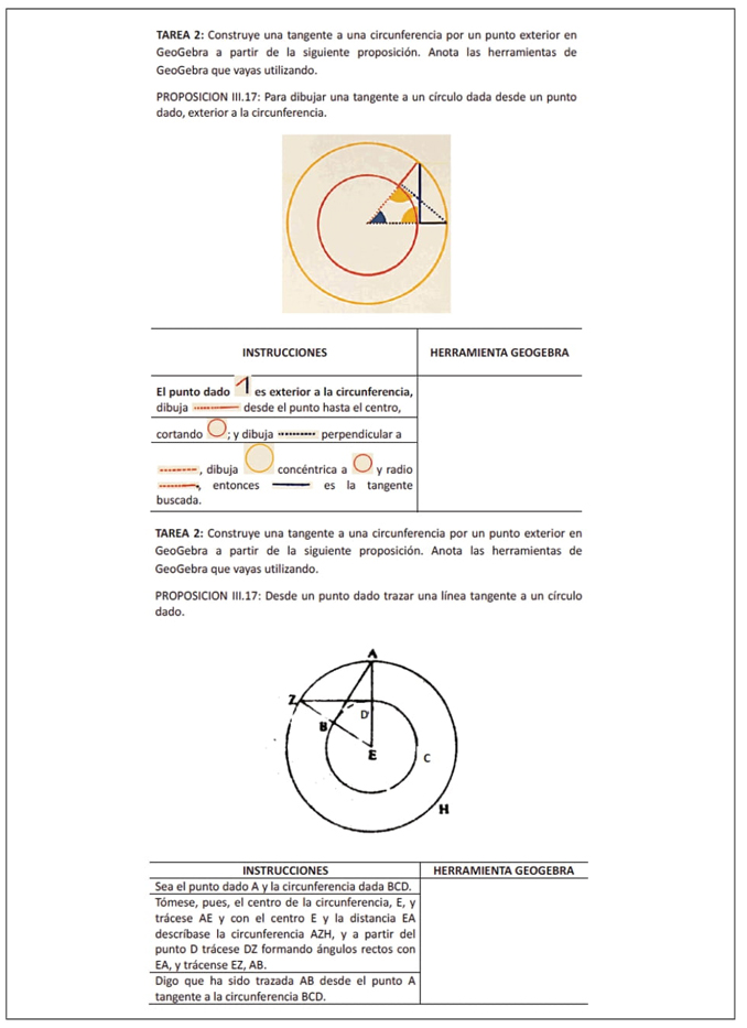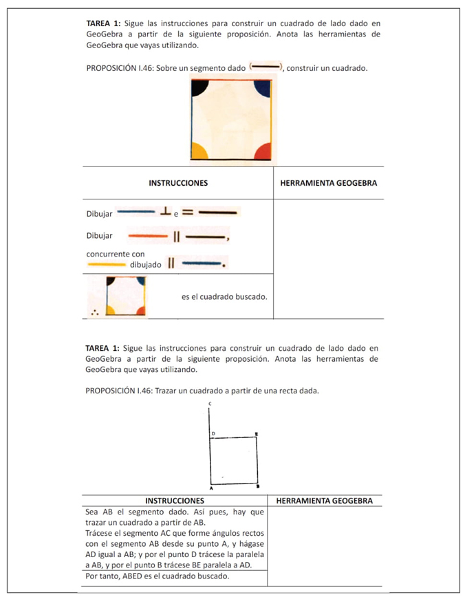 El cuestionario sobre el que trabajaron los alumnos constaba de tres tareas. Cada una de ellas consistía en la realización de una construcción geométrica. La Tarea 1 consistía en la construcción de un cuadrado a partir de un lado (Proposición 46 del Libro I de los Elementos), la Tarea 2 en la construcción de una tangente a una circunferencia por un punto exterior a ella (Proposición 17 del Libro III de los Elementos) y la Tarea 3 en la construcción de un triángulo a partir de tres segmentos tales que la suma de cada dos de ellos es mayor que el tercero (Proposición 22 del Libro I de los Elementos). En concreto, los alumnos debían reproducir las instrucciones proporcionadas por escrito, mediante el uso de GeoGebra, indicando, tal y como se observa en las Figuras 1 a 3, las herramientas utilizadas para realizar cada uno de los pasos de la construcción. Además, para cada una de las tres tareas, los alumnos disponían de un fichero GeoGebra en el que se proporcionaban los elementos iniciales sobre los que se debía realizar la construcción.