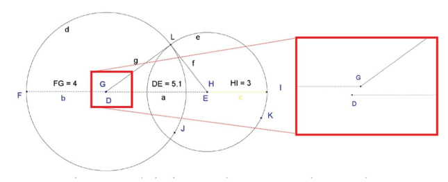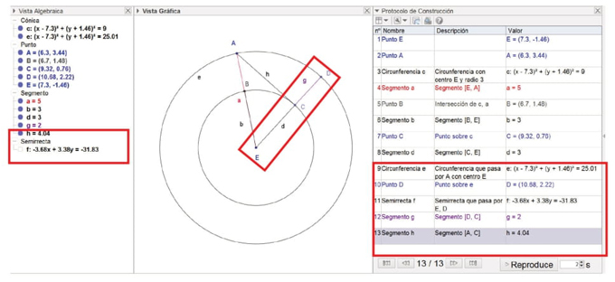 Otro ejemplo de este fenómeno puede observarse en la Figura 8, correspondiente a la Tarea 2. Los alumnos ajustaron el radio de la circunferencia e haciendo que pasara por el punto A, además se arrastró el punto D para que quedara aparentemente alineado con los puntos E y C; se ayudaron para ello de una semirrecta que posteriormente ocultaron.