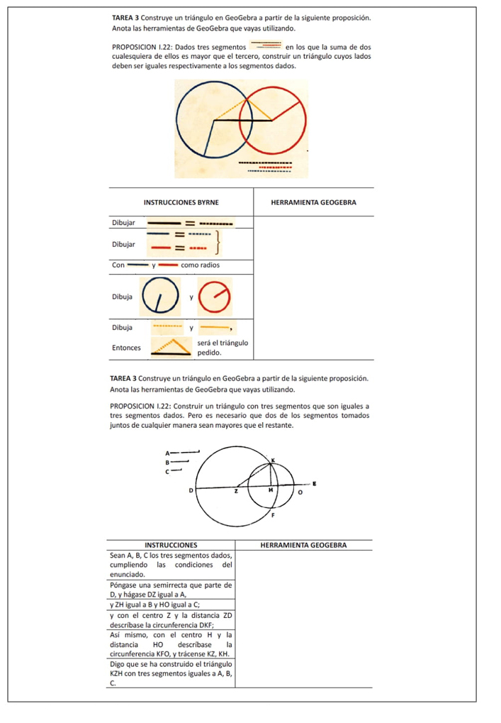 La Tarea 3 es la que presenta aparentemente mayores diferencias entre ambas versiones. La versión clásica implica la traslación de los tres segmentos dados sobre una misma semirrecta, mientras que en la versión de Byrne basta con trasladar dos de los segmentos usando como punto común en cada caso uno de los extremos del otro sin necesidad de que estén alineados. Aunque no tiene impacto sobre el proceso de construcción, es interesante señalar que la desigualdad triangular (la suma de dos cualesquiera de los segmentos debe ser mayor que el tercero) recibe un tratamiento ligeramente distinto en ambos textos. Mientras que en la versión de Byrne aparece como hipótesis, en la versión clásica se resalta la necesidad de este hecho.