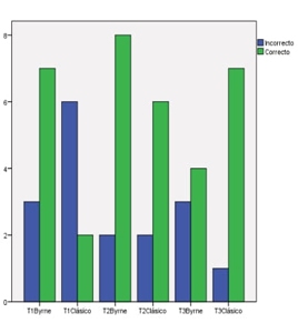 Es interesante señalar que, entre aquellos grupos que no respetaron las instrucciones, hay un porcentaje mucho mayor de acierto en la construcción en la versión B (un 77%) que en la versión C (un 50%). Por su parte, entre aquellos alumnos que respetaron las instrucciones rigurosamente, la versión C proporciona un porcentaje de aciertos ligeramente mayor (71% frente a 64%). Así pues, el sistema de representación de Byrne parece penalizar en menor medida el que los alumnos sigan un camino propio mientras que, al ser las instrucciones proporcionadas en la versión clásica más rigurosas y completas, su seguimiento favorece el éxito en la tarea.