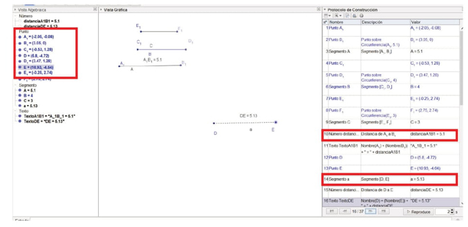 Otro posible ejemplo relacionado con este fenómeno se aprecia en la Tarea 3, donde algunos alumnos crearon nuevos segmentos con la herramienta ‘segmento de longitud dada’ a partir de las longitudes de los segmentos que se daban como datos. En la Figura 5 mostramos un momento intermedio de la construcción (tras el paso 14 del protocolo de construcción) donde podemos observar que los alumnos marcan las longitudes de los segmentos dados: en el paso 10 del protocolo de construcción marcan la longitud del segmento A1B1 (dado) y a continuación en el paso 14, marcan la longitud ED. Posteriormente repiten el mismo proceso con los segmentos C1D1 y E1F1.