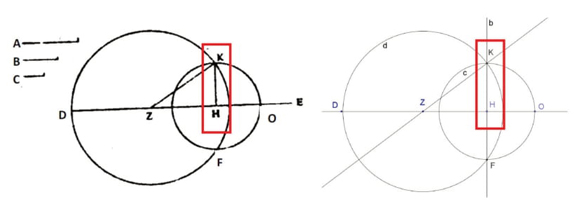 El comportamiento seguido por este grupo está muy relacionado con el intento de reproducir la ilustración, por encima del seguimiento de las instrucciones. En la Figura 6 (parte izquierda) vemos la ilustración proporcionada en el cuestionario. Pese a que lo parece, el segmento KH no es perpendicular al DE. Los alumnos, sin embargo, utilizaron la herramienta ‘perpendicular’ y, a partir de este paso, trataron de reproducir la ilustración dada tal y como se aprecia en la parte derecha de la citada figura.