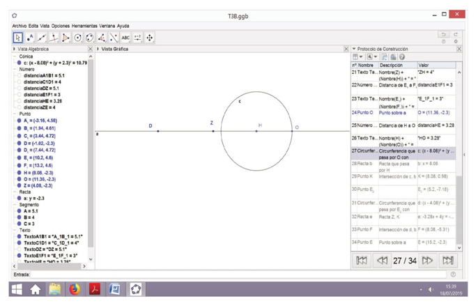 En algunas construcciones se observa, gracias a la revisión del protocolo de construcción, que, en lugar de trasladar a GeoGebra las propiedades matemáticas asociadas a las instrucciones proporcionadas, algunas parejas construyen objetos libres (que no dependen de los anteriores), para posteriormente ajustar la construcción y que se parezca lo más posible a la ilustración que acompaña a las instrucciones. En la transcripción siguiente, correspondiente a la tercera tarea, se observa este fenómeno.