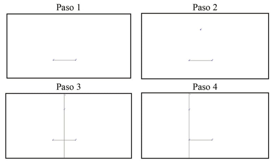 La ilustración que acompaña a las instrucciones es un dibujo, por tanto, no es posible extraer información teórica de la misma, sino que se le da un valor descriptivo. Esto forma parte del contrato didáctico establecido en nuestras clases de geometría. Si revisamos el protocolo de construcción de esta tarea (ver Figura 7), vemos el paso anterior a construir la perpendicular. Añadir la perpendicularidad facilita la construcción al dar a los alumnos un nuevo camino para encontrar la posición de un vértice como intersección de una circunferencia y una recta. No creemos que sea fruto de un despiste ya que no se ha pasado por alto un detalle o una instrucción, sino que se ha creado una nueva condición “siguiendo el dibujo” (en palabras de los estudiantes).