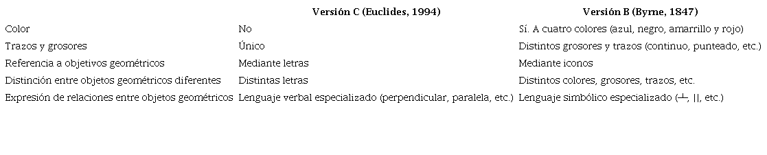Para alcanzar los objetivos planteados anteriormente, se crearon dos versiones del cuestionario. En una de ellas (que llamaremos versión C), las instrucciones y figuras proporcionadas a los alumnos provenían de la edición clásica de los Elementos de Euclides (Euclides, trad. en 1994). En la otra (que llamaremos versión B), se proporcionaron las instrucciones y figuras tal y como aparecen en la edición de los Elementos realizada por el inglés Oliver Byrne (Byrne, 1847). De los 18 grupos, 10 completaron el modelo B del cuestionario, mientras los 8 restantes completaron el modelo C. En la versión C se evitó el uso de letras del alfabeto griego, que fueron sustituidas por letras mayúsculas del alfabeto latino.