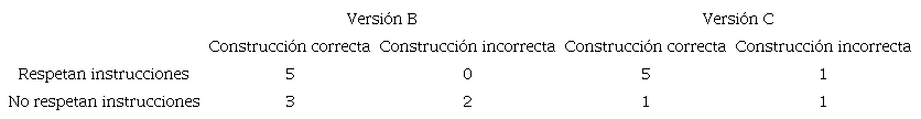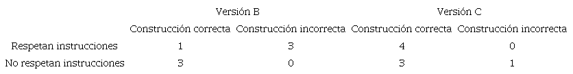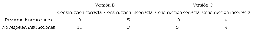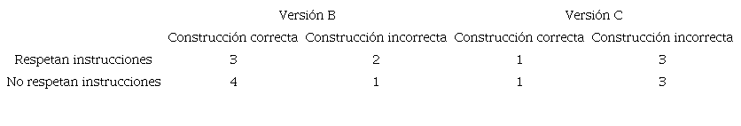 El seguimiento de las instrucciones se produjo con independencia de la versión del cuestionario con el que estaban trabajando los estudiantes. Del mismo modo, no hubo dependencia entre la corrección de la construcción y el seguimiento de las instrucciones (Tabla 3).