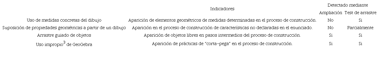 Un interesante indicador del grado de instrumentación alcanzado por los estudiantes en el uso de GeoGebra está relacionado con los tipos de arrastres que estos realizan al abordar una construcción geométrica. Arzarello et al. (2002) desarrollan una taxonomía en la que incluyen hasta siete tipos distintos: arrastre errante, arrastre unido, arrastre guiado, arrastre lugar oculto, arrastre de línea, arrastre enlazado y test de arrastre. Los que más nos interesan aquí, son el arrastre guiado (mover puntos de un objeto para darle una forma determinada), el arrastre lugar oculto (mover puntos de un objeto para que este siga manteniendo ciertas propiedades) y el test de arrastre (mover puntos para determinar si el objeto al que pertenece mantiene las propiedades deseadas).