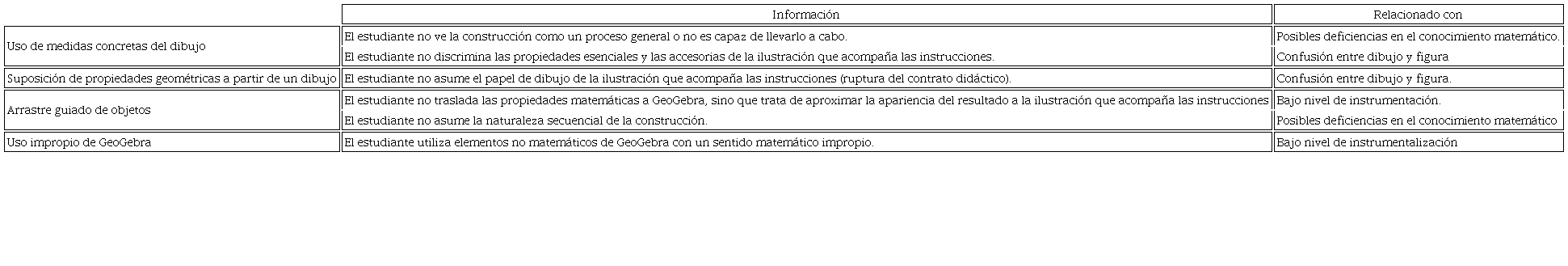 Aunque hemos tratado de caracterizar estos fenómenos, no pensamos que sean completamente independientes unos de otros, sino que están relacionados y en ocasiones se superponen unos y otros. De hecho, los fenómenos 1 y 2 tienen una mayor componente matemática mientras que los fenómenos 3 y 4 están más relacionados con los procesos de instrumentalización e instrumentación asociados al uso de GeoGebra. Estos dos factores fueron identificados por Ruiz-López (2017) como obstáculos en el proceso de génesis instrumental usando GeoGebra. En la Tabla 7, presentamos un resumen de la información proporcionada por cada uno de estos fenómenos y su relación con elementos teóricos de la literatura.