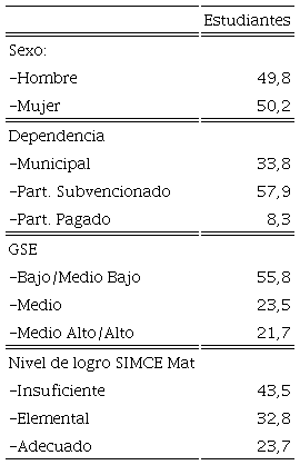 Es un grupo homogéneamente distribuido por sexo (50,2% son mujeres), con una preponderante presencia de residentes urbanos (96,7%). En su mayor parte asisten a establecimientos de administración Particular Subvencionada (57,9%) y son de nivel socioeconómico Bajo y Medio Bajo (55,8%), conforman grupos de tamaño heterogéneo con una media de 35.7 alumnos por curso, donde cerca de un tercio registra más de 40 integrantes (28,6%). En las pruebas SIMCE Matemáticas solo 23.7% de los estudiantes registra un nivel de logro adecuado, esto es, exhibe una apropiación pertinente de los contenidos del curriculum vigente, con lo cual puede resolver gran cantidad de ejercicios directamente, seleccionando y organizando información. Por otra parte, un significativo 43.5% no supera los 252 puntos SIMCE, situándose en un nivel de logro insuficiente, por lo que escasamente cuentan con los aprendizajes elementales sobre conceptos y procedimientos del razonamiento matemático para el año académico en que se encuentran.
