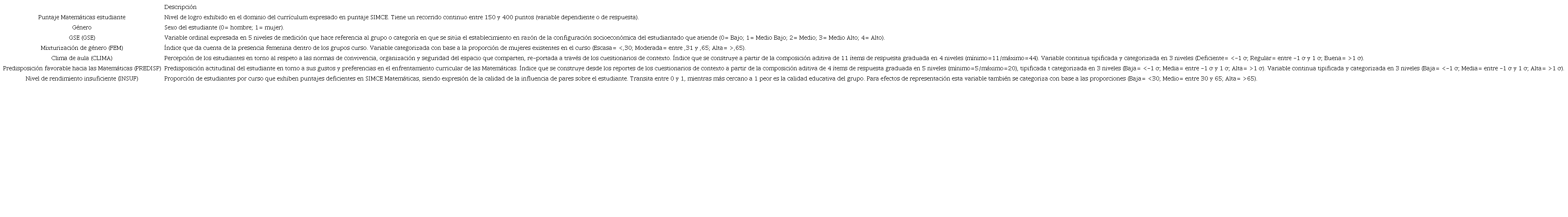 Para efectos de esta investigación se hace uso explícitamente de los resultados de la Prueba SIMCE Matemáticas correspondientes a Segundo año de Enseñanza Media o Secundaria del proceso de medición 2014. Datos de puntaje y nivel de logro alcanzado en la Prueba SIMCE Matemáticas que es complementada con información extraída de los cuestionarios de contexto contestados por los propios estudiantes. De estos instrumentos se agregan las variables/ índices Predisposición favorable hacia las matemáticas (PREDISP) y Percepción del clima de aula en que acontece el aprendizaje (CLIMA). A un nivel más agregado, considerando como unidad de análisis atributos del grupo curso o colegio, se incorporan las variables de capital cultural y socioeconómico de los alumnos que preferentemente atiende el establecimiento (GSE), la mixturización de género expresada en la proporción de mujeres que integran el grupo curso (FEM) y la calidad de la exposición de pares con base al rendimiento que obtiene la unidad educativa en SIMCE Matemáticas (INSUF).