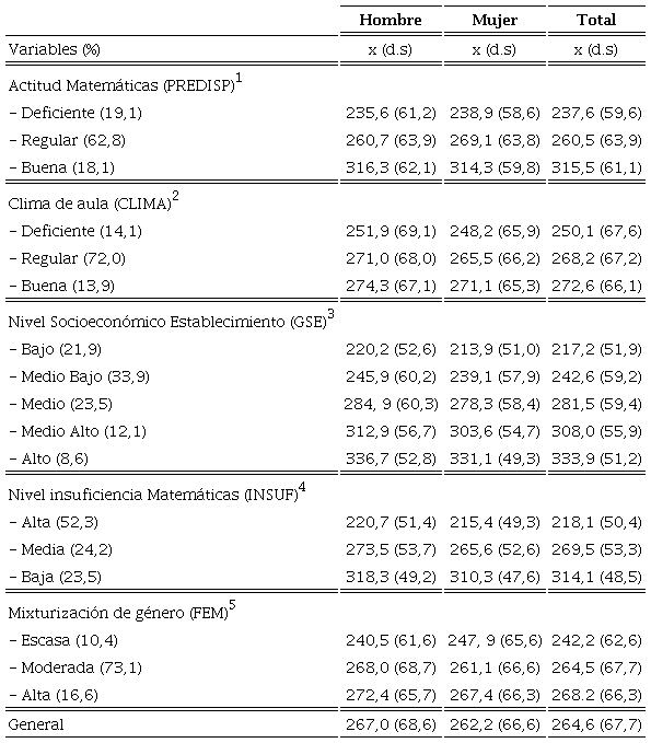 De acuerdo al perfil del estudiante se observan mejoras significativas en el nivel de logro exhibido en la prueba SIMCE Matemática en razón de una más favorable predisposición que se tenga con y para el aprendizaje de los contenidos de este subsector [PREDISP; F=13324,5; gl=2; p<0,01 ], y la mejor percepción que se tenga del clima del aula [CLIMA; F=828,48; gl=2; p<0,01 ]. En términos agregados, los rendimientos mejoran conforme aumenta el capital cultural o nivel socioeconómico del establecimiento [GSE; F=19168,02; gl=4; p<0,01 ]; existe una menor proporción de estudiantes al interior del curso que presentan un nivel insuficiente de rendimiento en Matemáticas, como expresión de las condiciones de educabilidad o calidad de la influencia de pares [INSUF; F=52197,8; gl=2; p<0,01 ]; y la presencia de mujeres se vuelve predominante [FEM; F=9486; gl=2; p<0,01 ].