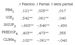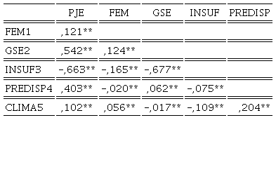 La matriz de correlaciones del Tabla 3 evidencia relaciones intensas y significativas de la variable respuesta (PJE) con cada una de las independientes, particularmente elevadas con INSUF [Ry3= -,663; P<0,001 ], GSE [Ry2=,542; P<0,001 ] y PREDISP [Ry4=,403; P<0,001 ]. Menos relevante pero igualmente significativos son los coeficientes de correlación para las variables FEM [Ry1=,121; P<0,001 ] y CLIMA [Ry5=,102; P<0,001 ].