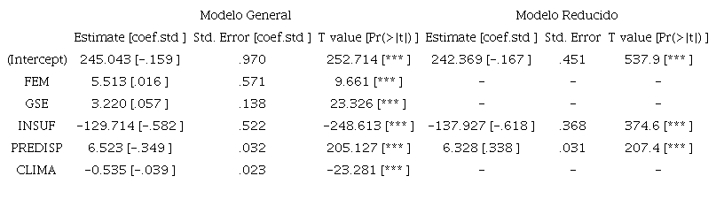 PJE= 245.043 + 5.513(FEM) + 3.220(GSE) - 129.714(INSUF) + 6.523(PREDISP) - 0.535(CLIMA)