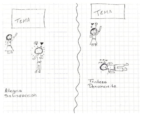 Centremos la atención en la Figura 2 y obsérvese cómo la docente, el tema y el estudiante se ven involucrados en la situación desencadenante de la emoción. A la izquierda aparece la docente con una sonrisa, debido a que el alumno ha entendido su explicación del tema, esto se deduce al observar al alumno con un foco sobre la cabeza, lo que da cuenta de una emoción positiva que ella etiqueta como alegría y satisfacción. Al lado derecho, aparece una situación opuesta: la docente aparece con una mueca triste, con lágrimas, con signos de admiración e interrogación sobre su cabeza. Consideramos que con todos estos signos ella expresa su desconcierto ante la situación. En el caso del alumno, la serie de zetas junto a él, nos lleva a pensar en el aburrimiento y la falta de atención. Con esta última imagen, la docente representa la tristeza y el desconcierto cuando el estudiante no entiende el tema que ella explica. Interpretamos que la situación que desencadena la emoción, positiva y la negativa, es el aprendizaje de los temas.