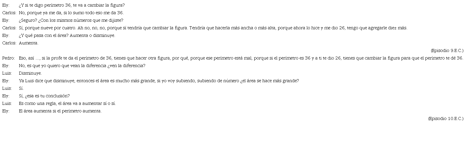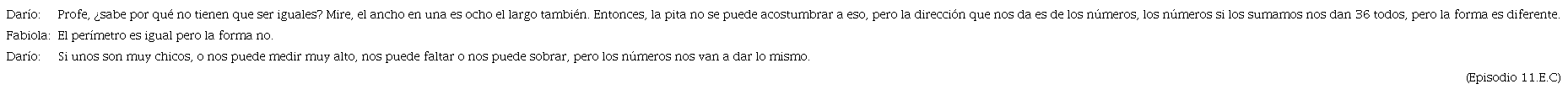 En este episodio se presentan algunas de las conclusiones obtenidas por los estudiantes después de demarcar el perímetro de los cinco rectángulos con un trozo de hilo. Es preciso utilizar las características necesarias para definir el concepto de perímetro (KPM, condiciones necesarias y suficientes para generar definiciones) para no generar obstáculos en el aprendizaje de los estudiantes. Durante la clase se entregaron las siguientes definiciones de perímetro: el contorno; lo de afuera; y suma de los lados, sin hacer referencia al perímetro como una medida longitudinal. Al calcular los perímetros, en todos los rectángulos obtuvieron 36u, pero al medirlos con el hilo no lograron utilizar un único trozo para demarcar los perímetros de todos los rectángulos. Esto llevó a algunos estudiantes a realizar una disociación entre la medida del perímetro representada por el hilo y el resultado obtenido al sumar la medida de los lados.
