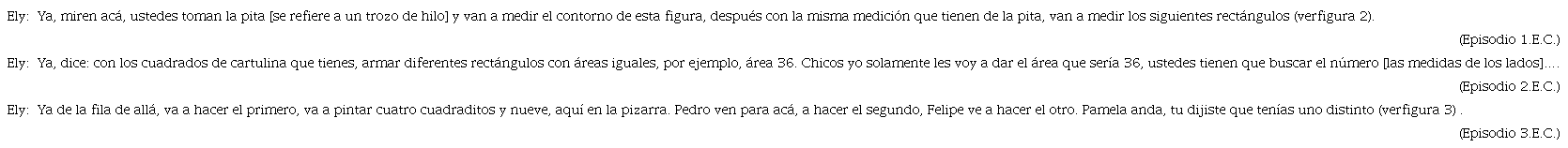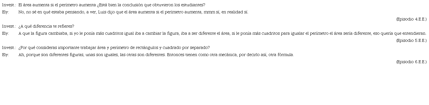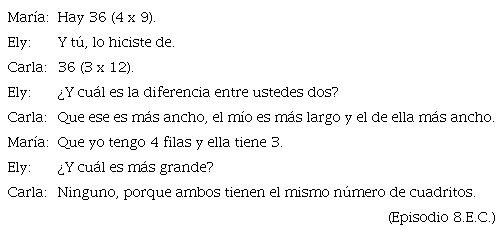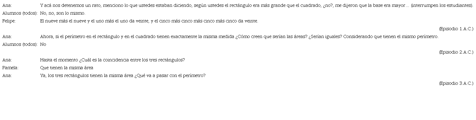 Dado que se identificó un número elevado de episodios13 en los cuales se observó la movilización de conocimientos que podríamos llamar “triviales” (como, por ejemplo, “la profesora conoce la diferencia entre área y perímetro”), nos centraremos en aquellos que nos permiten analizar conocimientos que consideramos claves al momento de abordar la relación área-perímetro.