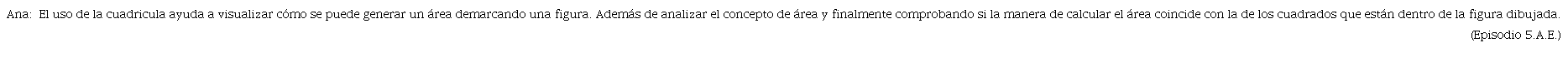 En estos episodios podemos observar más evidencias del KMT movilizado por Ana; vemos que conoce la potencialidad del recurso cuadricula, que permite a los estudiantes visualizar la magnitud del área de los rectángulos representados en ella.