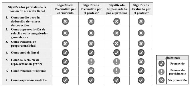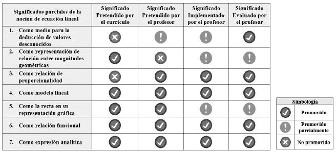 Al determinar los significados curriculares se concluyó que, a partir de lo planteado por el programa del bachillerato tecnológico, los significados de la ecuación lineal propuestos se centraron en las acepciones de expresión analítica, modelo lineal y la recta en su representación gráfica. Posteriormente se concluyó que los significados de la ecuación lineal pretendidos por el profesor A fueron los de modelo lineal y expresión analítica; en apartados anteriores se presentó que el significado de la ecuación lineal implementado por el profesor A consistió esencialmente en dos acepciones: expresión analítica y modelo lineal. Finalmente, en esta sección se describió que el significado de la ecuación lineal evaluado por el profesor A se centró en esas dos mismas acepciones: expresión analítica y modelo lineal, aunque también se tuvo la presencia de la ecuación como relación funcional. Asimismo, se destacó la presencia de pequeños esbozos sobre el significado de ecuación lineal como la recta en su representación gráfica tanto en lo pretendido como en lo implementado.